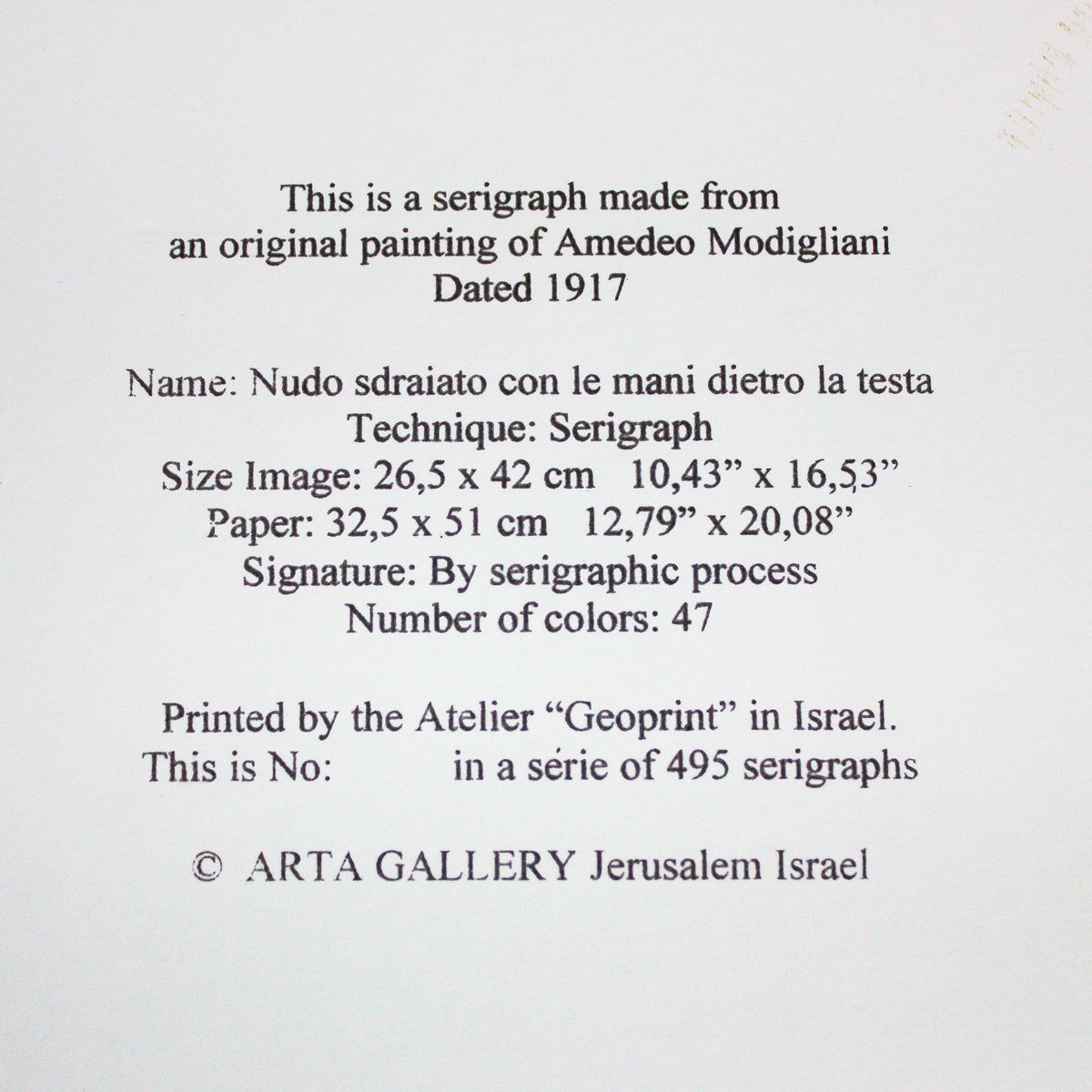 Artist: Amedeo Modigliani. Medium: Serigraph. Title: Nudo Sdraiato Con Le Mani Dietro La Testa. Size: 14" x 19". Signature: Stamp signed and numbered. Certificate of Authenticity: Is included. Additional: Printed By the Atelier "Geoprint" in Israel. Edition number as shown might vary..
