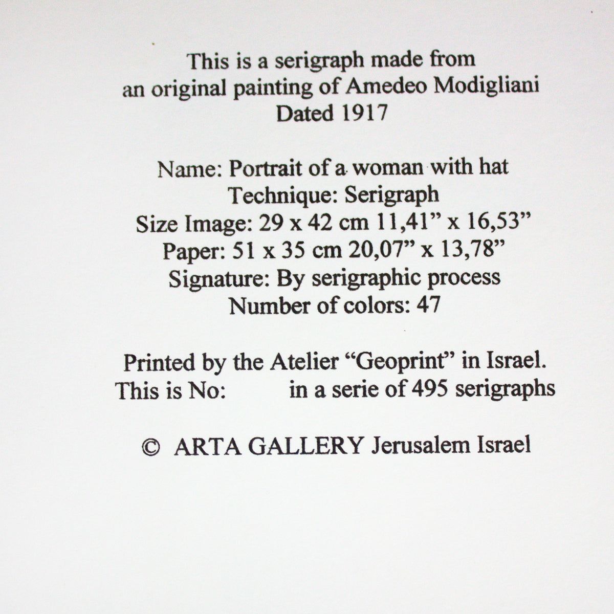 Artist: Amedeo Modigliani. Medium: Serigraph. Title: Protrait Of A Woman With Hat. Size: 20" x 14". Signature: Stamp signed and numbered. Certificate of Authenticity: Is included. Additional: Printed By the Atelier "Geoprint" in Israel. Edition number as shown might vary..