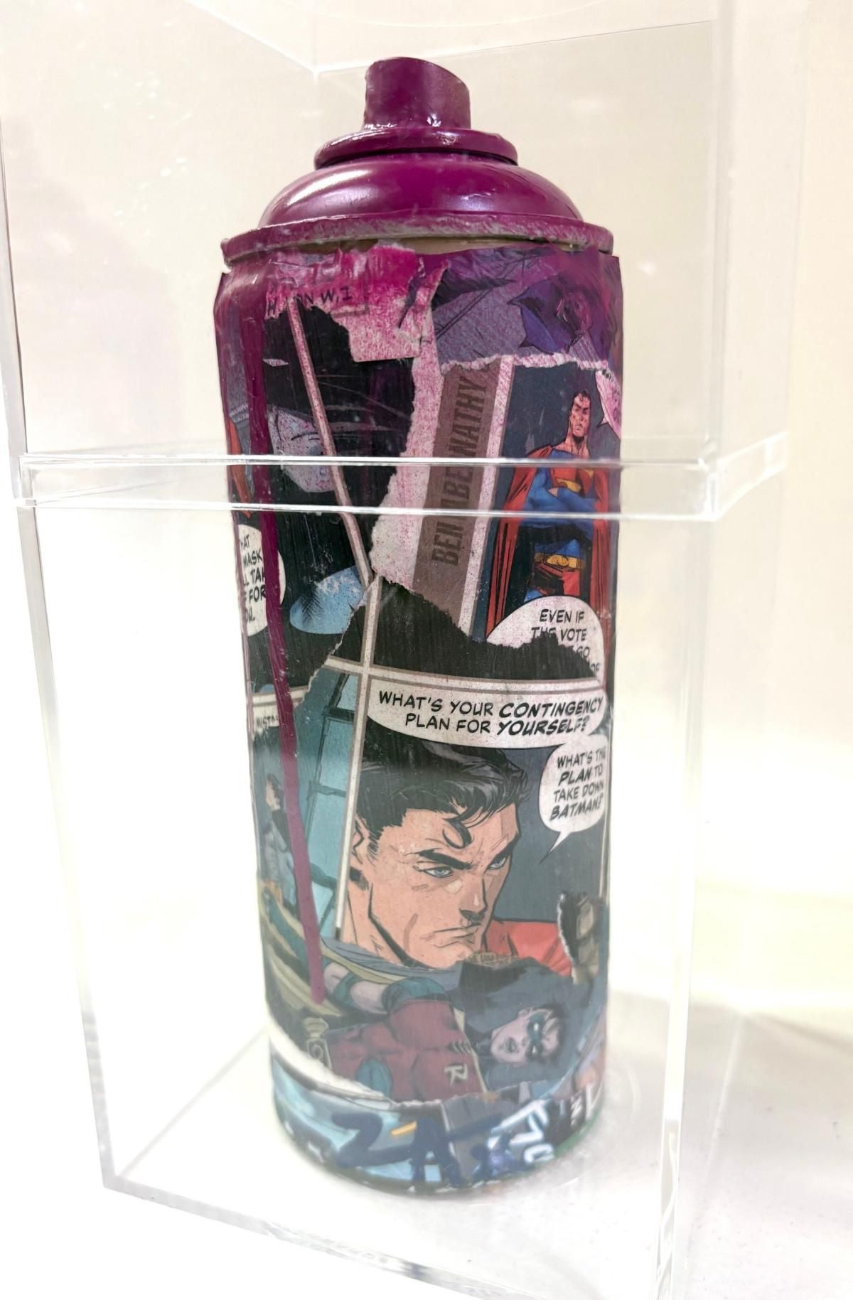 Artist: E.M Zax. Medium: 1/1 unique collage and paints on artist used spray can. Size: 4" x 8". Signature: Hand Signed. Additional: Displayed in lucite box Size: 4x4x8. Reference#: 25178.