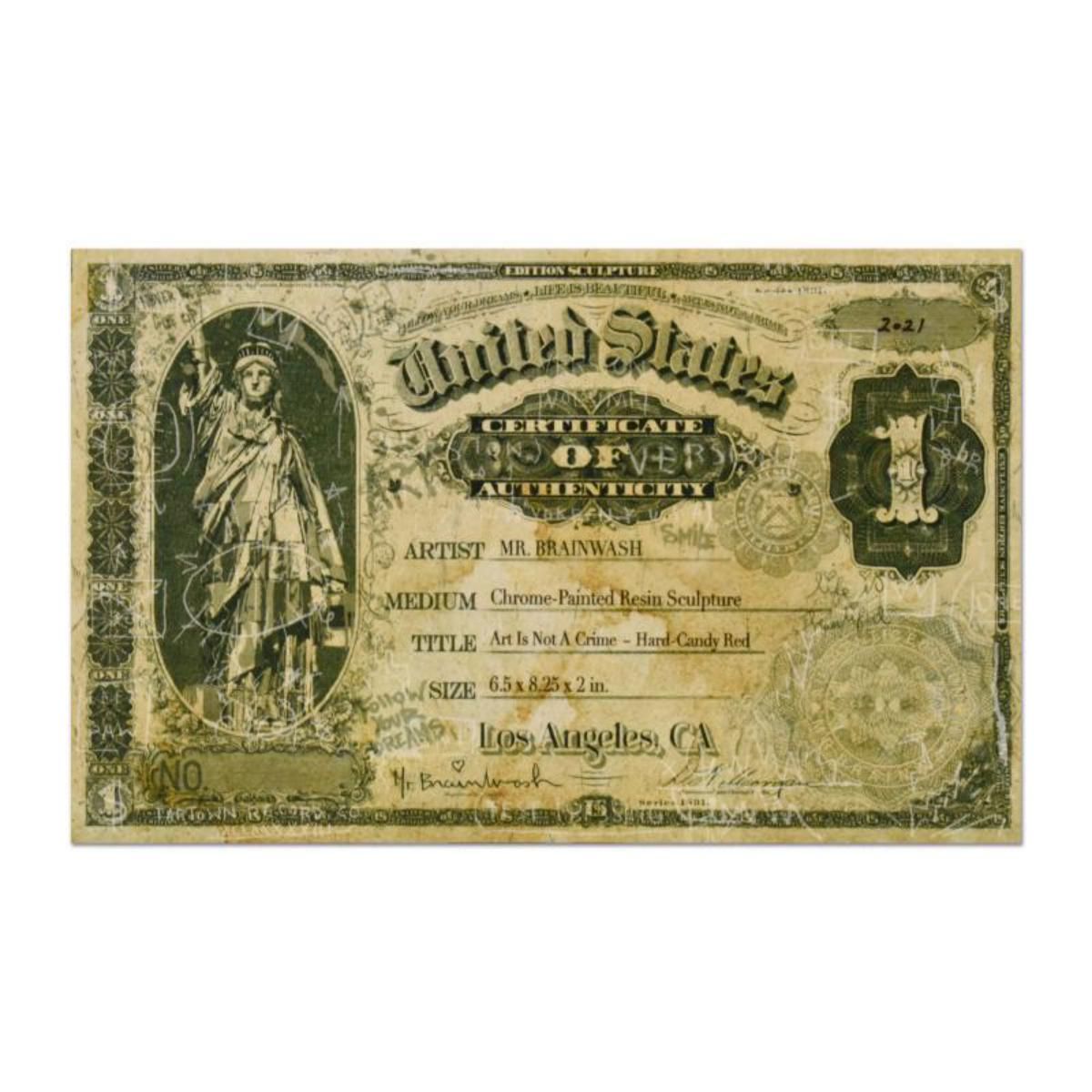 Artist: Mr. Brainwash. Medium: Resin Sculpture. Title: Art Is Not a Crime (Chrome Red). Size: 8" x 6.5". Signature: Hand Signed and Numbered by the artist. Certificate of Authenticity: Is included. Additional: Measures approx. 8" x 6.5" x 2. Reference#: 16667.