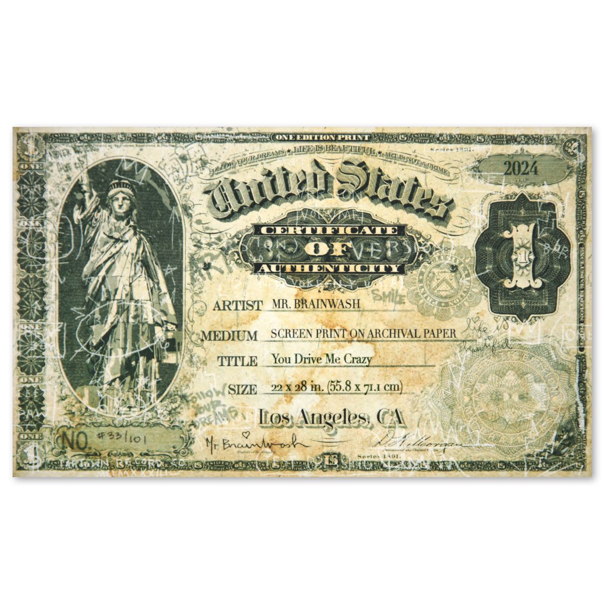 Artist: Mr. Brainwash. Medium: Silk Screen. Title: You Drive Me Crazy. Size: 23" x 29". Measures approx. 28" x 34" (framed). Signature: Hand signed and numbered by the artist. Certificate of Authenticity: Is included. Reference#: 80628.