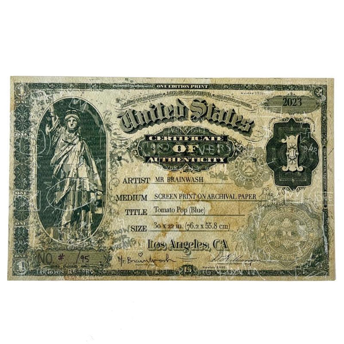 Tomato Pop (Blue) is a limited edition uniquely hand-finished silk screen print on paper by Mr Brainwash. The piece is hand signed and thumb-printed by the artist. The piece comes custom framed and with a Certificate of Authenticity. Measures approximately 42" x 34" (framed), 30" x 22" (image). This item requires special handling and may have a longer than usual turnaround. Reference#: 92321.