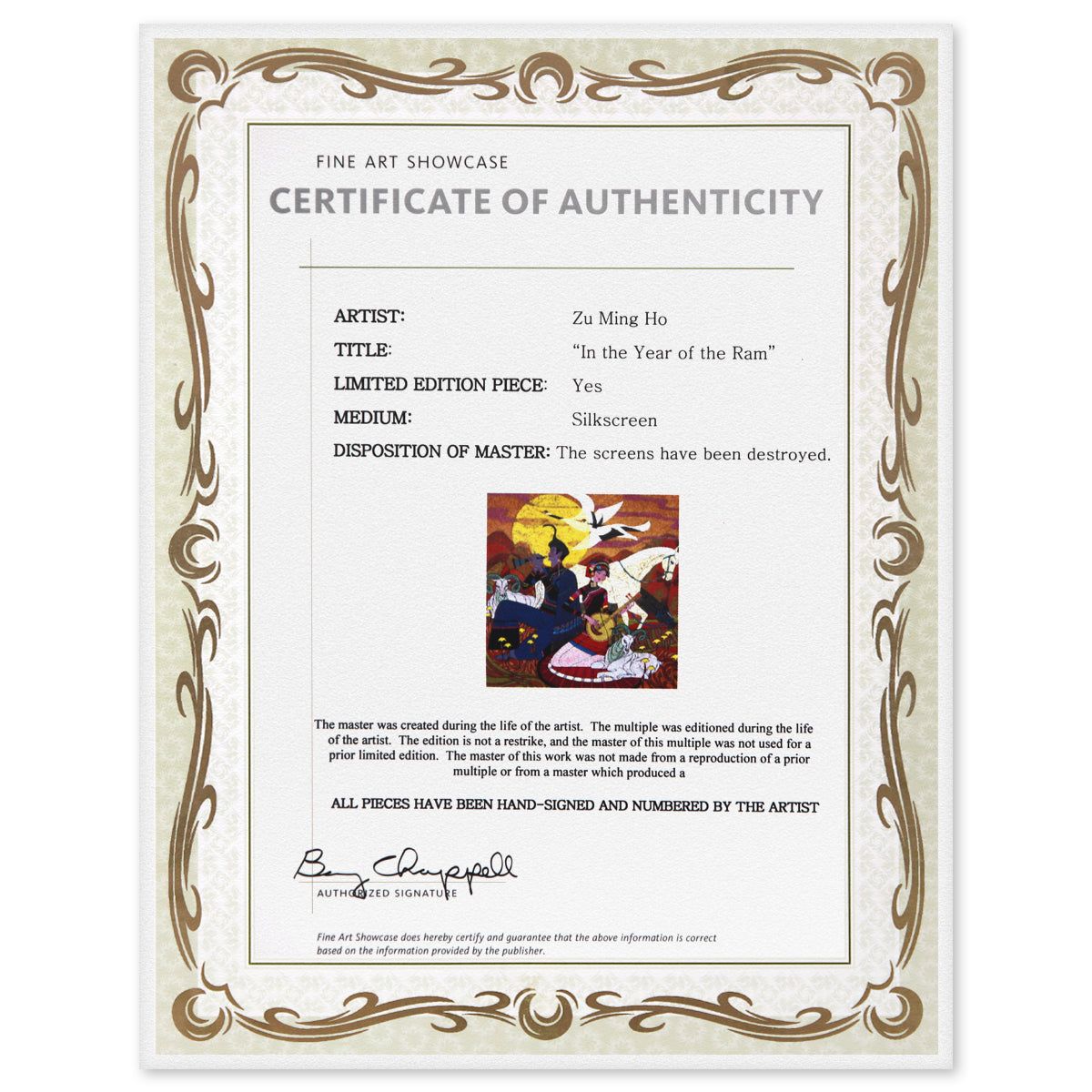 Artist: Zu Ming Ho. Medium: Silkscreen. Title: In the Year of the Ram. Size: 24" x 24". Signature: Hand signed and numbered. Reference#: 74848.