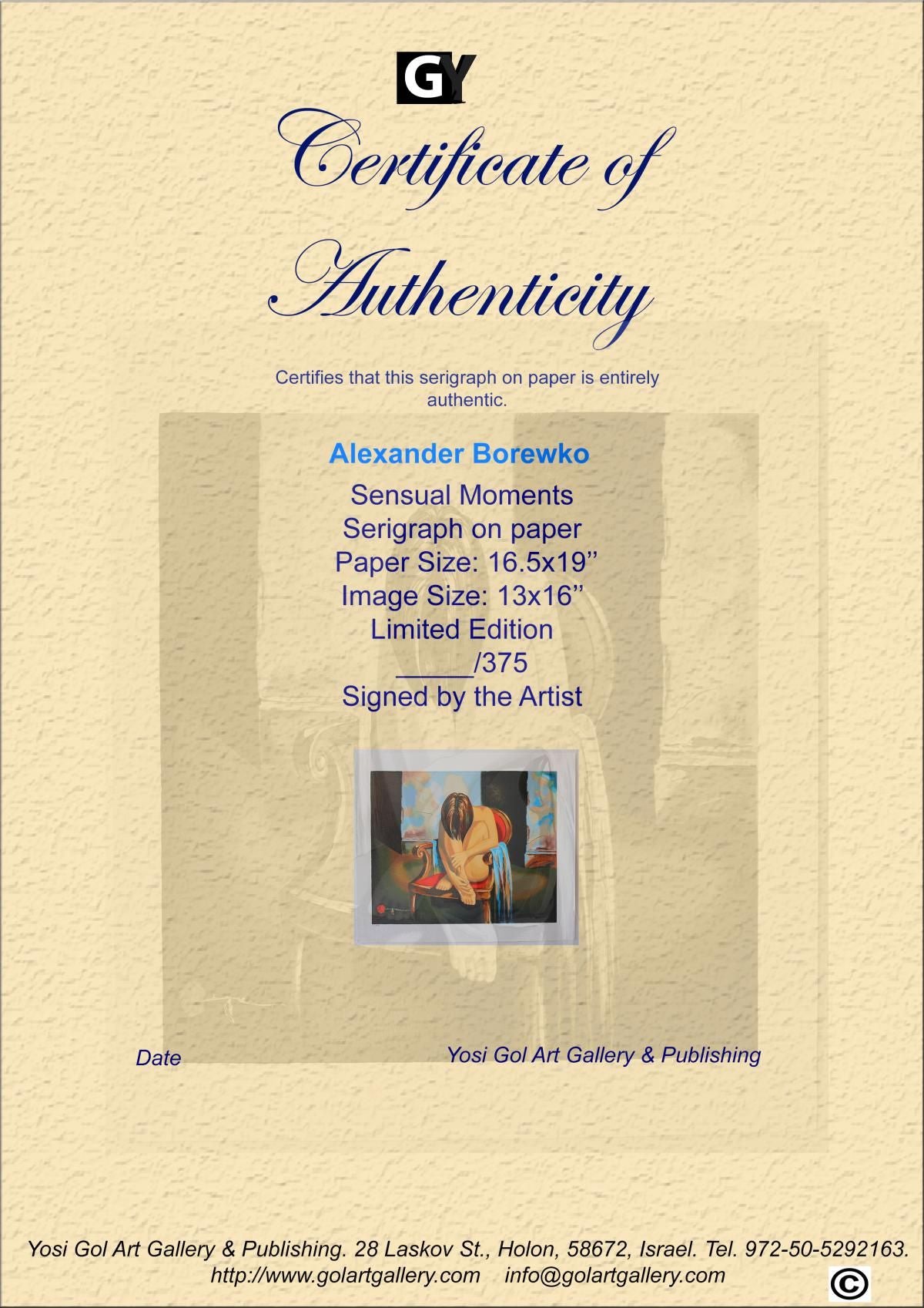 Artist: Alexander Borewko. Medium: Original Serigraph on Paper. Title: Sensual Moments. Size: 16.5" x 19". Signature: Hand Signed by the Artist. Certificate of Authenticity: From the publisher. Reference#: 20906.