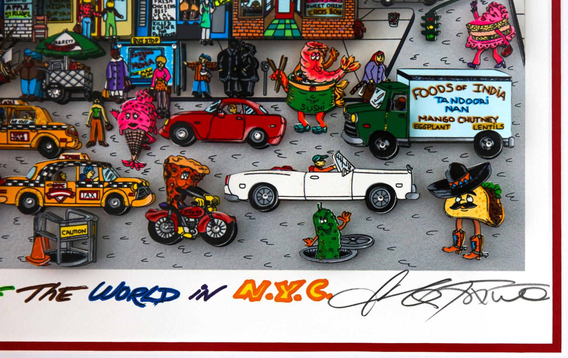Artist: Charles Fazzino. Medium: 3D Construction Silkscreen Serigraph. Title: Get A Taste of the World in N.Y.C (Red). Size: 25" x 24". Measures approx. 34" x 33" (framed). Signature: Hand Signed and Numbered by the artist. Certificate of Authenticity: From the publisher. Additional: Custom framed. Reference#: 17887.