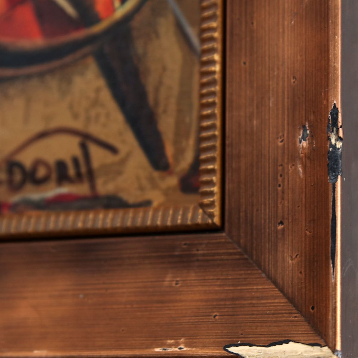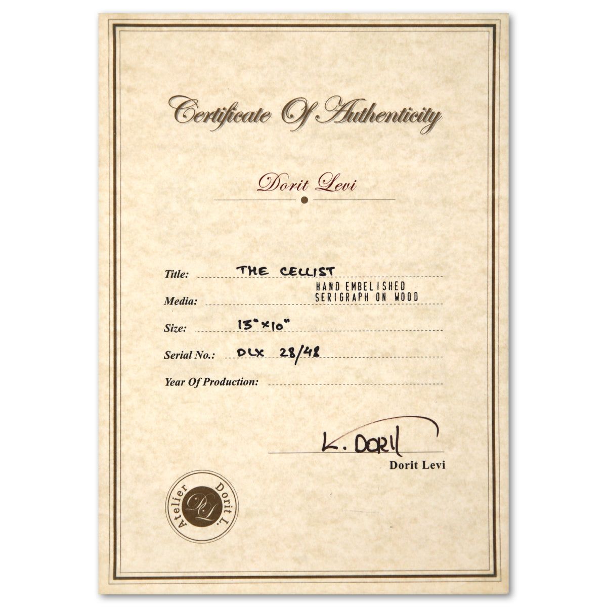 Artist: Dorit Levy. Medium: Hand Emelished Serigraph on Wood. Title: The Cellist. Size: 12" x 9". Measures approx. 16" x 12" (framed). Signature: Hand Signed and Numbered. Additional: Visible damages to the frame. Reference#: 74511.