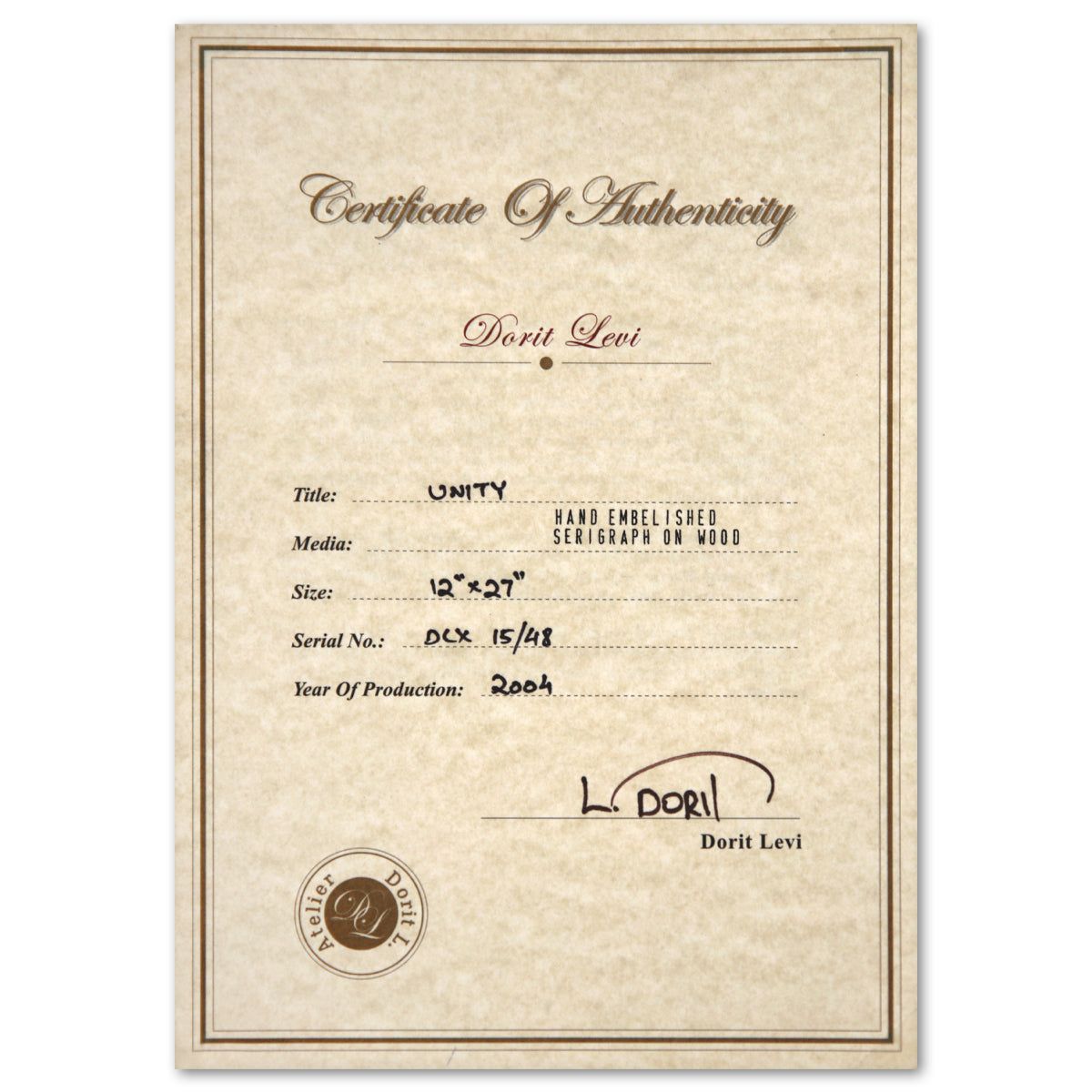 Artist: Dorit Levy. Medium: Hand Emelished Serigraph on Wood. Title: Unity. Size: 12" x 26". Measures approx. 15" x 30" (framed). Signature: Hand Signed and Numbered. Additional: Minor damages to the frame. Reference#: 74510.