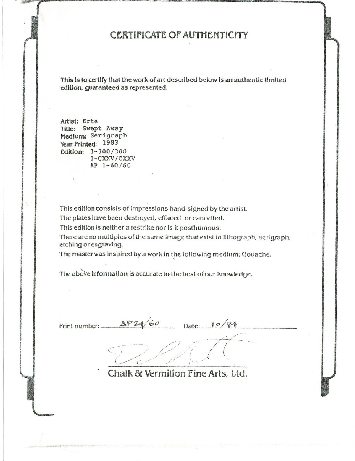 Artist: Erte. Medium: Serigraph. Title: Swept Away. Size: 30" x 22". Measures approx. 38" x 29" (framed). Signature: Hand Signed and numbered. Certificate of Authenticity: Is Included. Additional: AP 24/60.