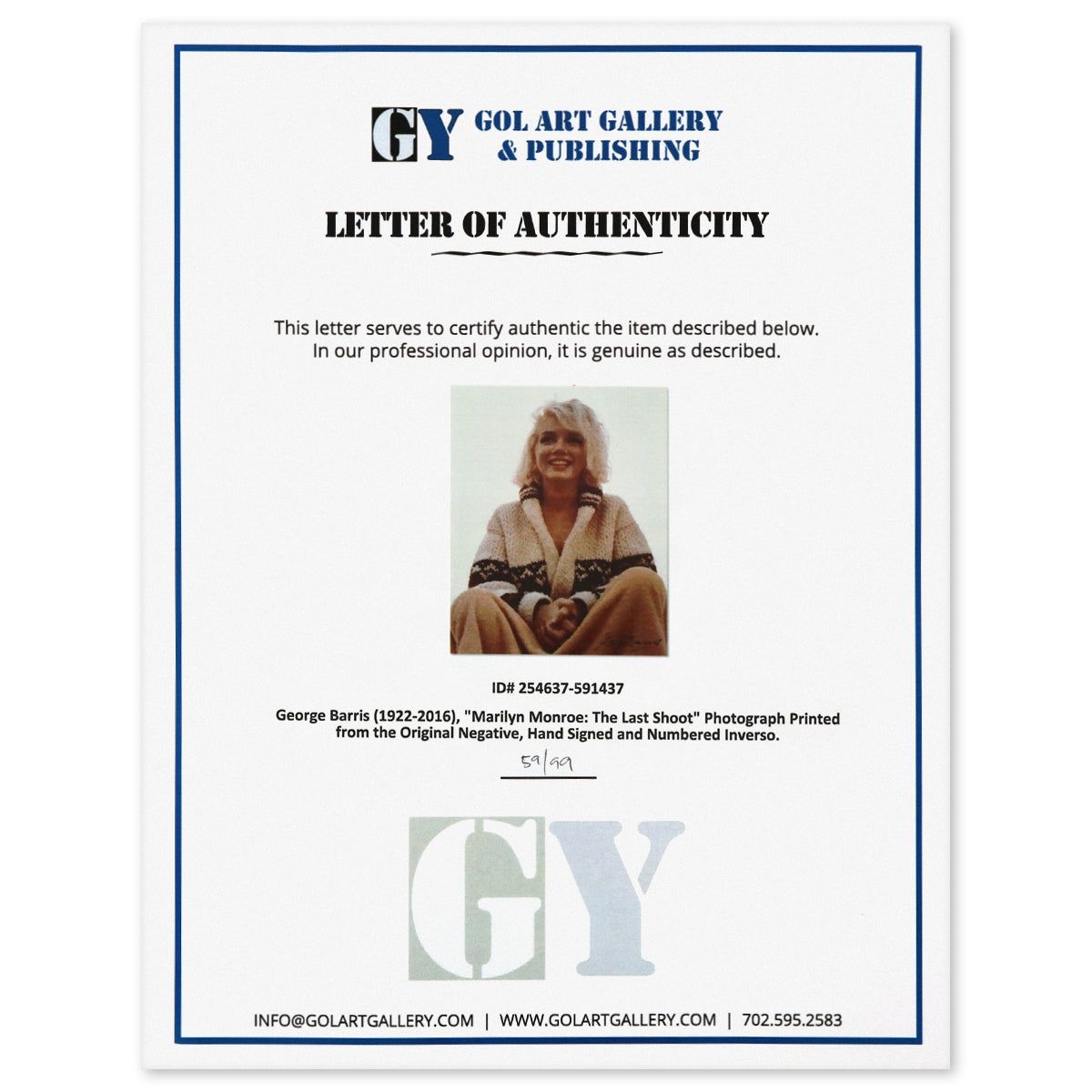 Artist: George Barris (1922-2016). Medium: Photograph Printed from the Original Negative. Title: Marilyn Monroe: The Last Shoot. Size: 11" x 8.5". Signature: Hand signed. Certificate of Authenticity: Is included. Reference#: 47537.