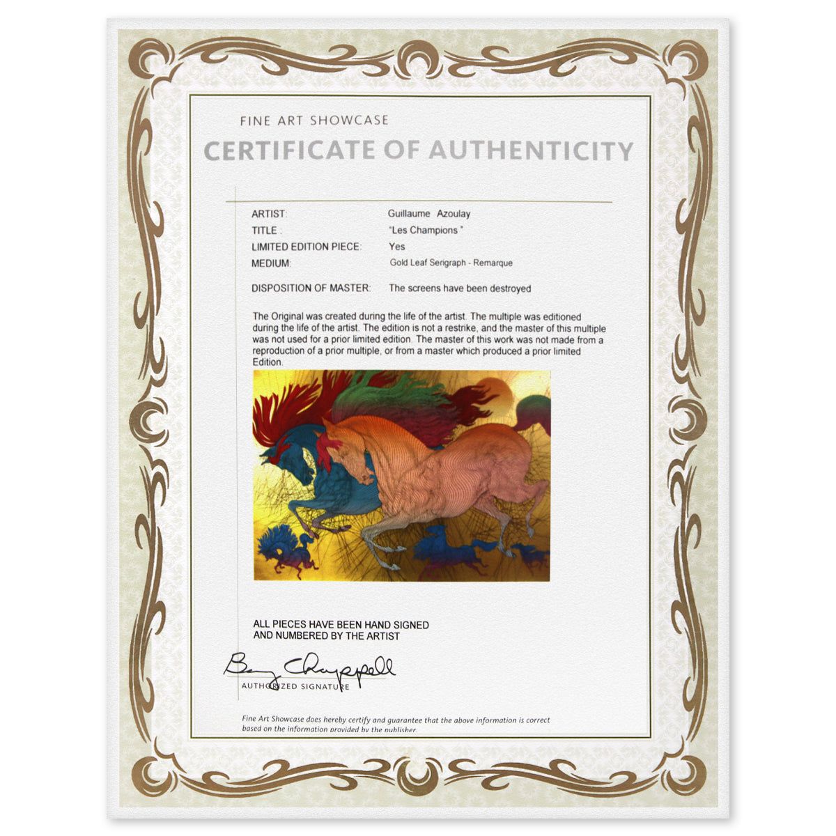Artist: Guillaume Azoulay. Medium: Gold Leaf Serigraph. Title: Les Champions. Size: 37" x 47". Signature: Hand Signed and Numbered. Reference#: 74617.