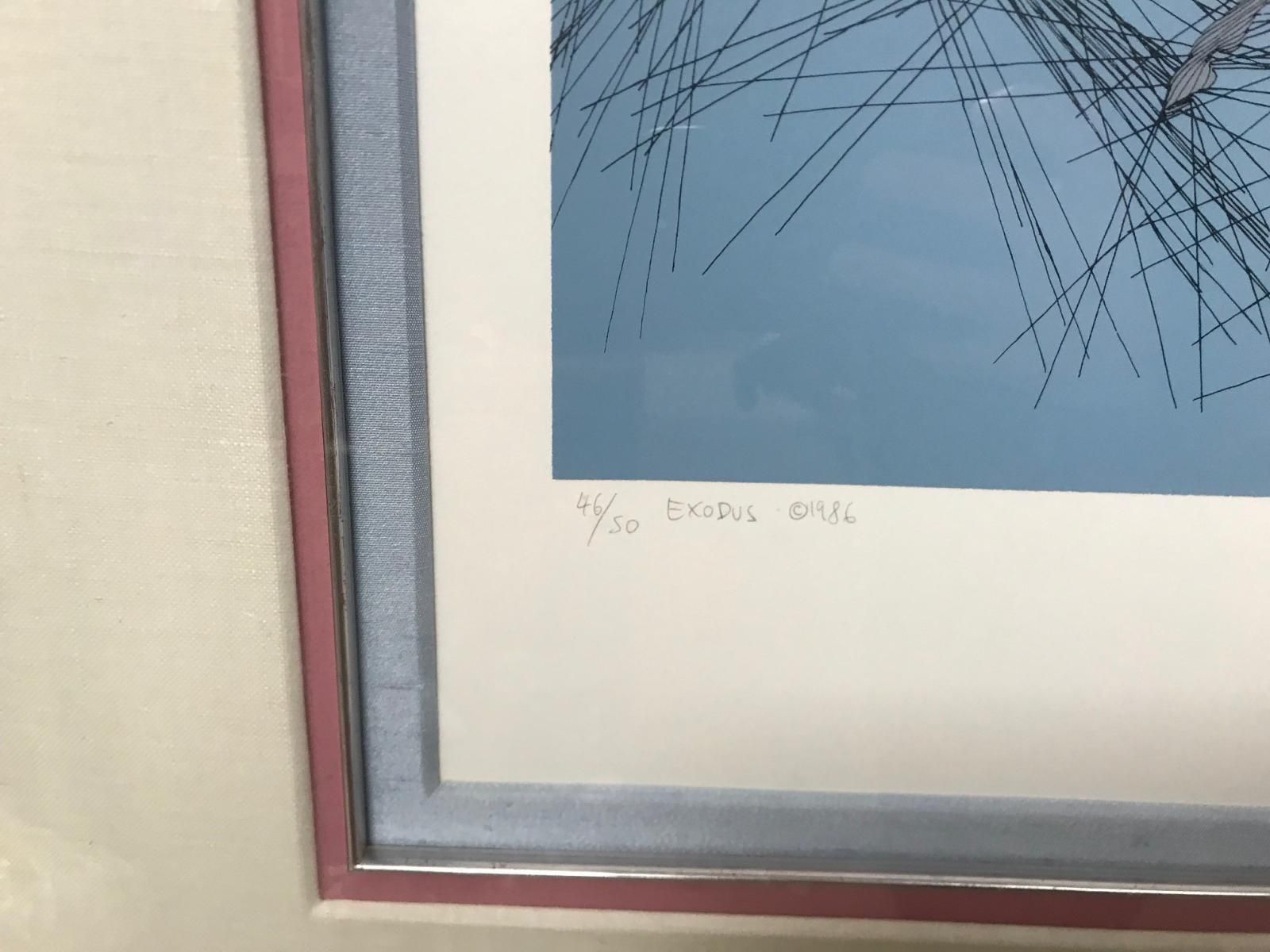 Artist: Guillaume Azoulay. Medium: Serigraph on paper with hand drawn remarque. Title: Exodus. Measures approx. 40" x 50" (framed). Signature: Hand signed and numbered. Reference#: 28135.