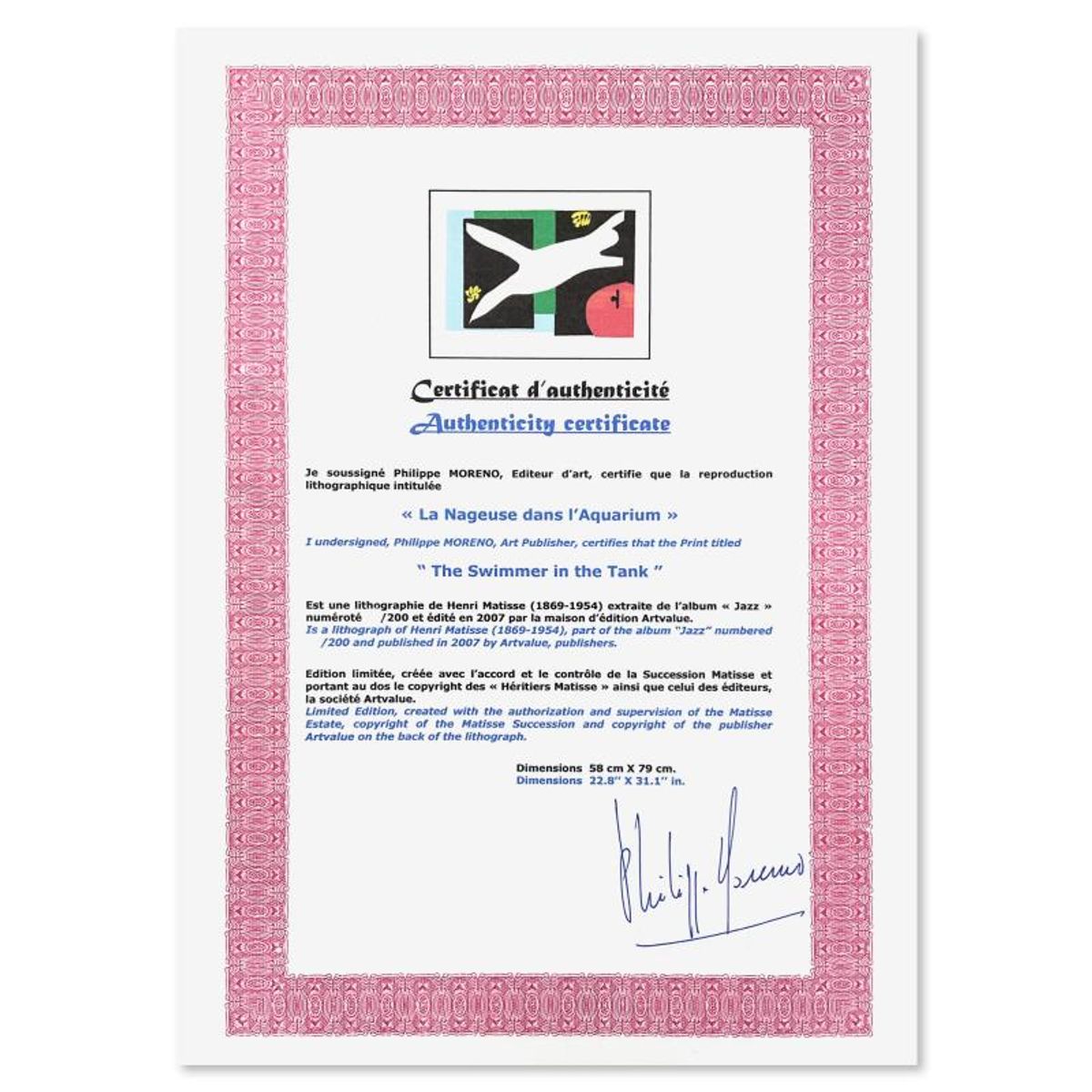 Henri Matisse 1869-1954 (After), "La Nageuse dans l'Aquarium (The Swimmer in the Tank)" Framed Limited Edition Lithograph with Certificate of Authenticity.