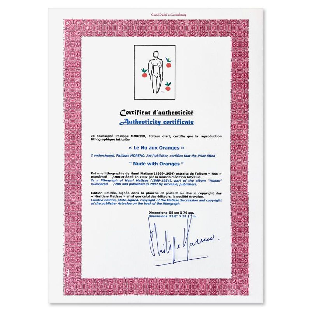 Henri Matisse 1869-1954 (After), "Le Nu aux oranges" Framed Limited Edition Lithograph with Certificate of Authenticity.