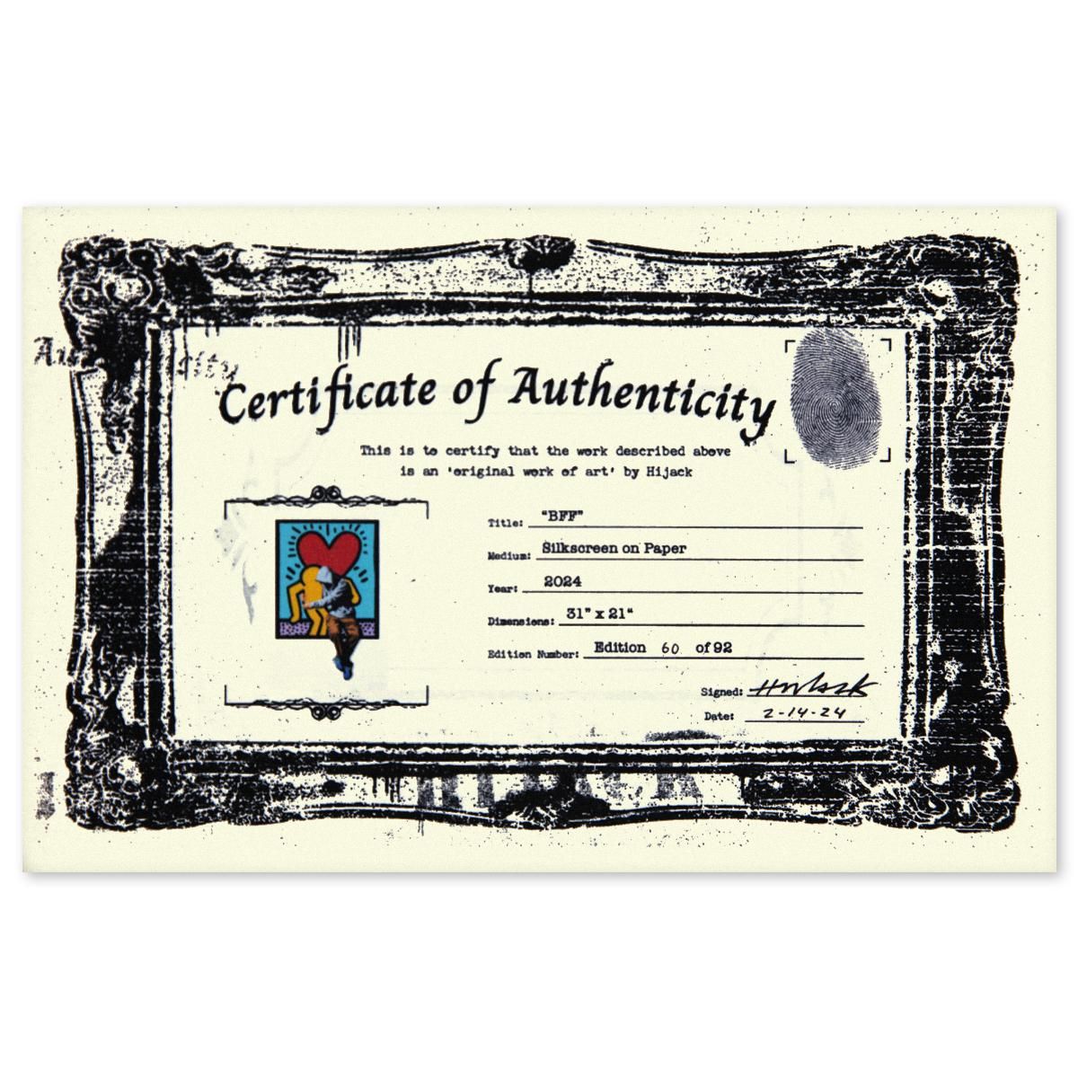 Artist: Hijack. Medium: Serigraph in Colors on Paper. Title: BFF. Size: 31" x 21". Measures approx. 36" x 26" (framed). Signature: Hand signed and numbered. Certificate of Authenticity: Is included. Reference#: 58321.