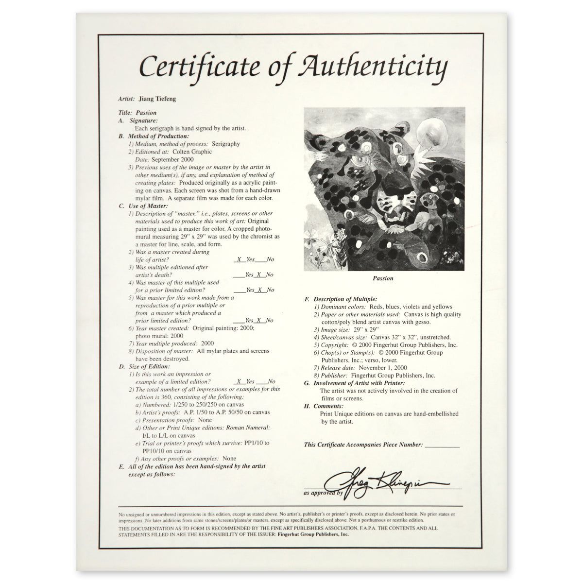 Artist: Jian Tie Feng. Medium: Serigraph. Title: Passion. Size: 29" x 29". Signature: Hand Signed and Numbered. Reference#: 80548.