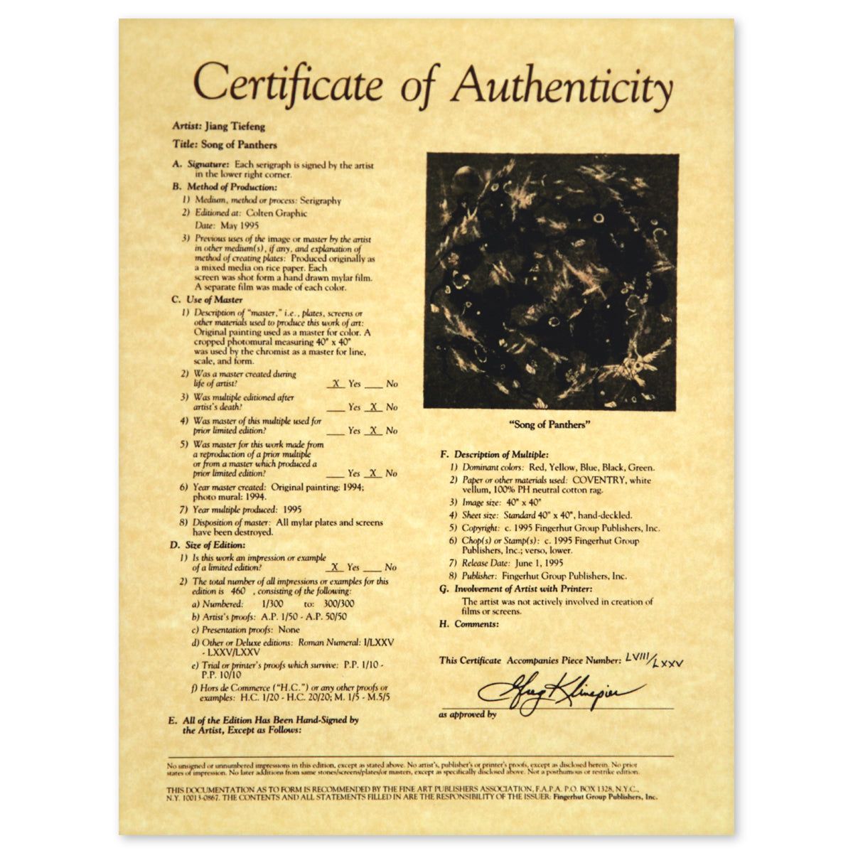 Artist: Jian Tie Feng. Medium: Serigraph. Title: Son of Panthers. Size: 40" x 40". Signature: Hand Signed and Numbered. Reference#: 80542.