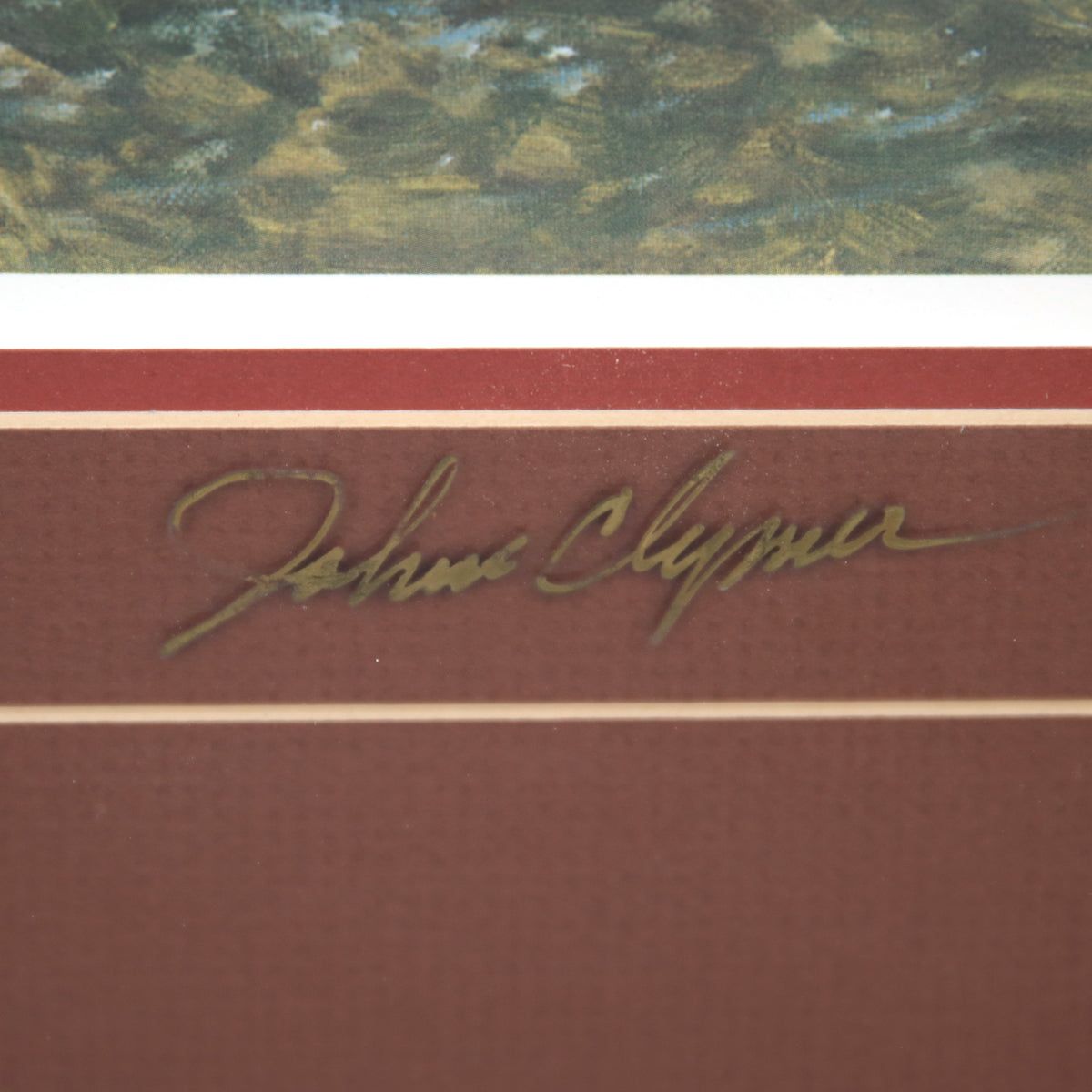 Artist: John Clymer. Medium: Offset Lithograph. Title: Trapper. Size: 17" x 28". Measures approx. 28" x 38" (framed). Signature: Signed and numbered. Additional: Disclaimer: The frame shows some signs of wear consistent with age and handling. Please refer to the images for details. Additional images are available upon request. Reframing may be recommended based on personal preference.. Reference#: 82529.