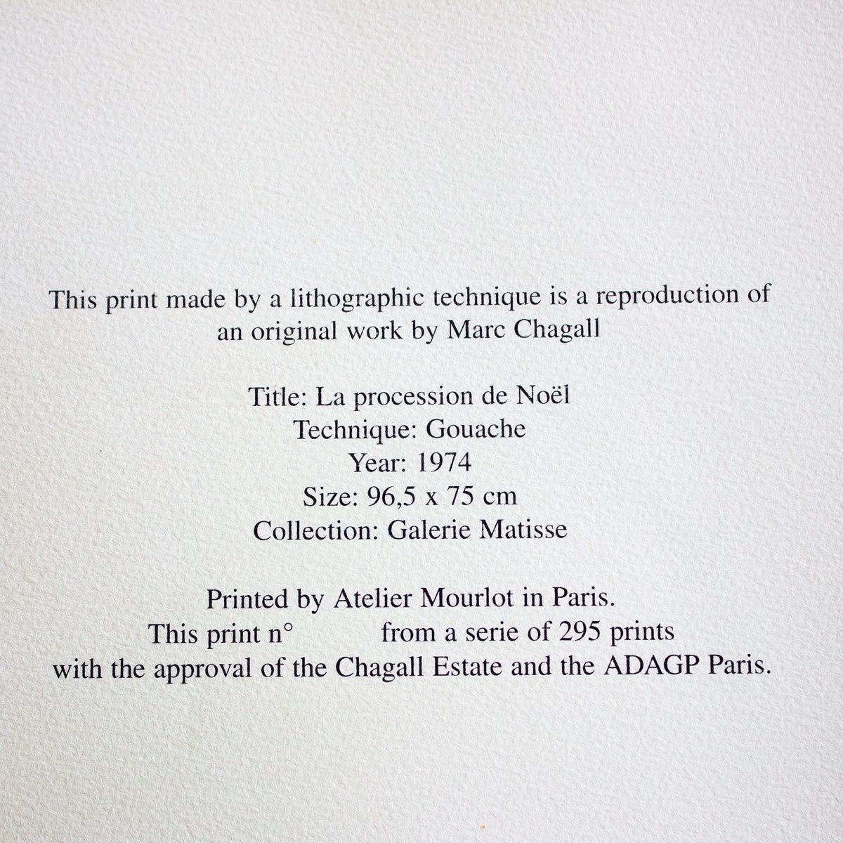 Artist: Marc Chagall. Medium: Lithograph. Title: La Procession De Noel. Size: 24" x 30.5". Signature: Stamp signed and numbered. Certificate of Authenticity: Is included. Additional: Printed by Atelier Mourlot in Paris. Authrorized by the Chagall Estate and ADAGP Paris (Society of Authors in the graphic and Platsic Arts). Edition number as shown might vary.. Reference#: 47493.