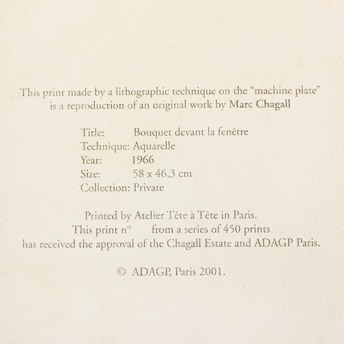 Artist: Marc Chagall. Medium: Lithograph. Title: Le Bouquet Devant La Fenetre. Size: 24" x 19". Signature: Stamp signed and numbered. Certificate of Authenticity: Is included. Additional: Printed by Atelier Tete a Tete in Paris. Authrorized by the Chagall Estate and ADAGP Paris (Society of Authors in the graphic and Platsic Arts). Edition number as shown might vary.. Reference#: 47480.