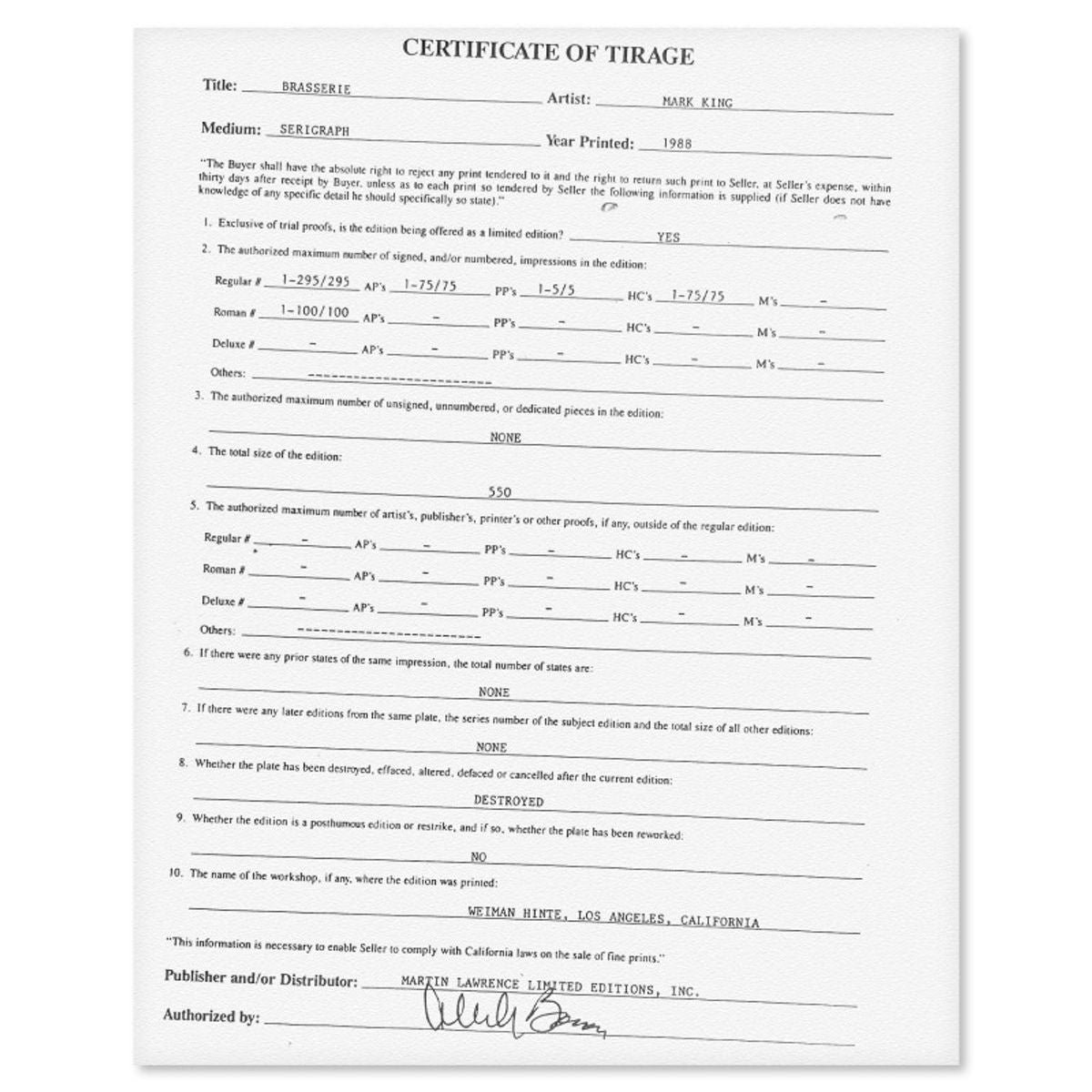 Mark King (1931-2014), "Brasserie" Hand Signed Limited Edition Serigraph with Letter of Authenticity.