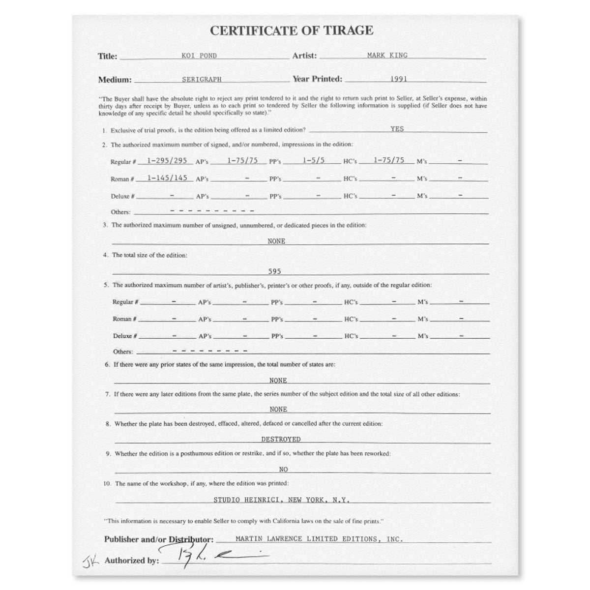 Mark King (1931-2014), "Koi Pond" Hand Signed Limited Edition Serigraph with Letter of Authenticity.