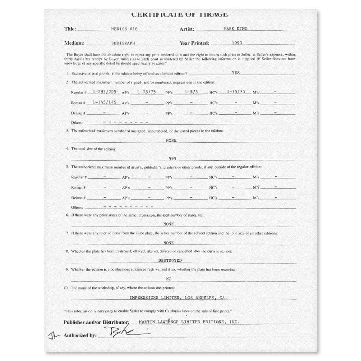 Mark King (1931-2014), "Merion #16" Hand Signed Limited Edition Serigraph with Letter of Authenticity.