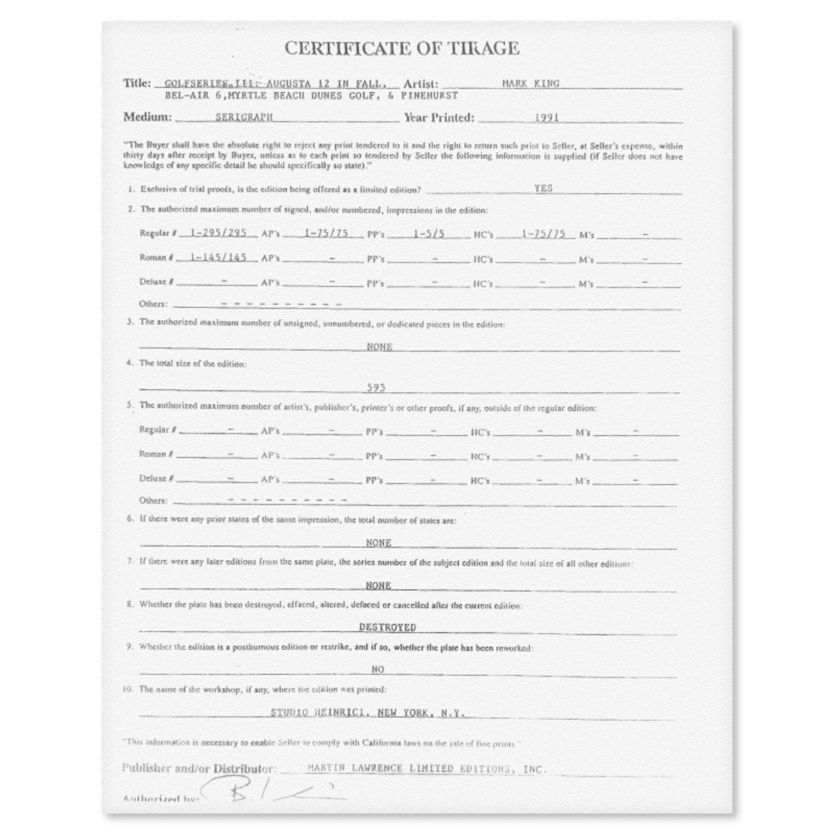 Pinehurst II (4 Up Golf) is a limited edition serigraph on paper by Mark King (1931-2014). Hand signed and numbered, this piece comes with a letter of authenticity and measures approximately 15" x 20" (image). Reference#: 91766.