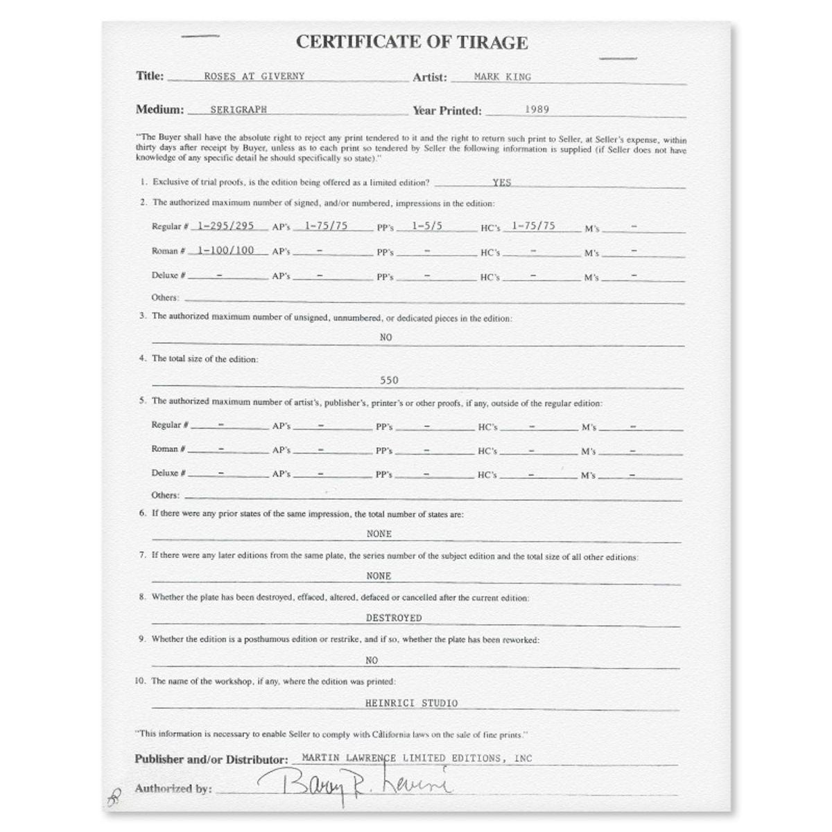 Mark King (1931-2014), "Roses At Giverny" Hand Signed Limited Edition Serigraph with Letter of Authenticity.