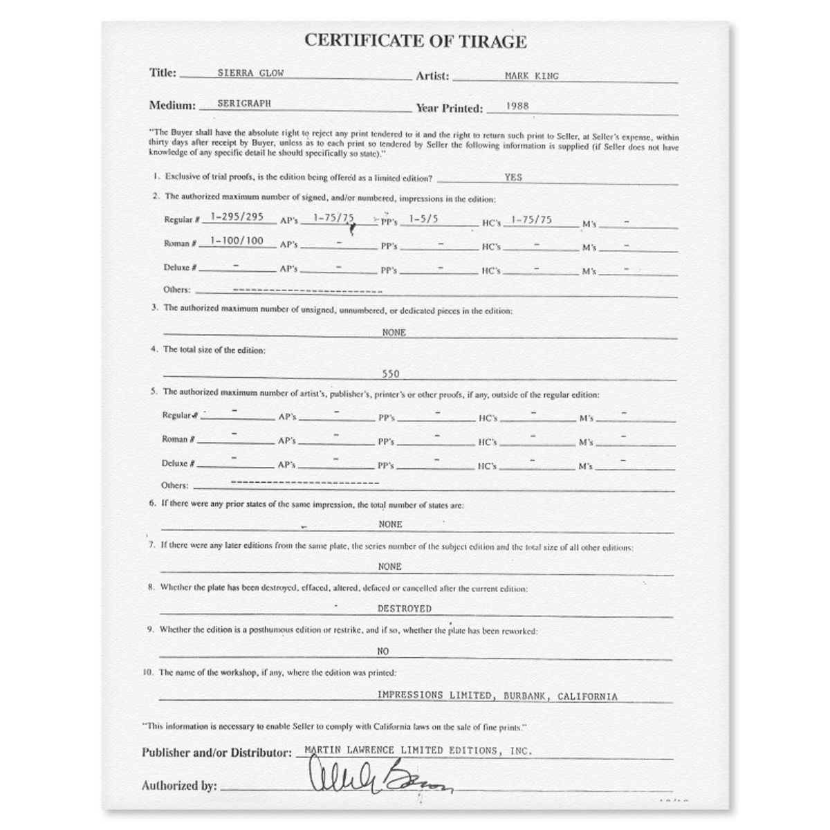 Sierra Glow is a limited edition serigraph on paper by Mark King (1931-2014). Hand signed and numbered, this piece comes with a letter of authenticity and measures approximately 28" x 37" (image). Reference#: 91775.