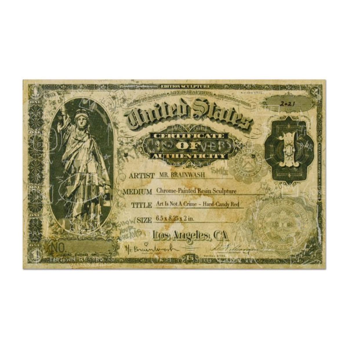 Art Is Not a Crime (Chrome Red) is a limited edition resin sculpture by Mr. Brainwash, numbered and hand signed by the artist. Includes Certificate of Authenticity. Measures approx. 8" x 6.5" x 2". Reference#: 92266.