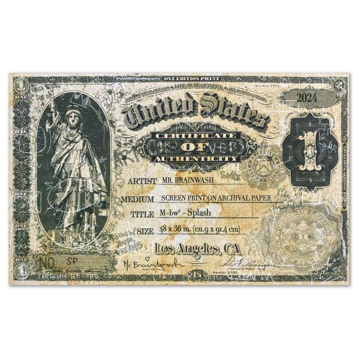 M=bw² - Splash, 2024 is a limited edition silkscreen on deckle edge paper by Mr Brainwash, hand signed by the artist. This piece comes framed. Includes Certificate of Authenticity. Measures approx. 52.5" x 40.5" (frame), 48" x 36" (image). This item requires special handling and may have longer than usual turnaround.