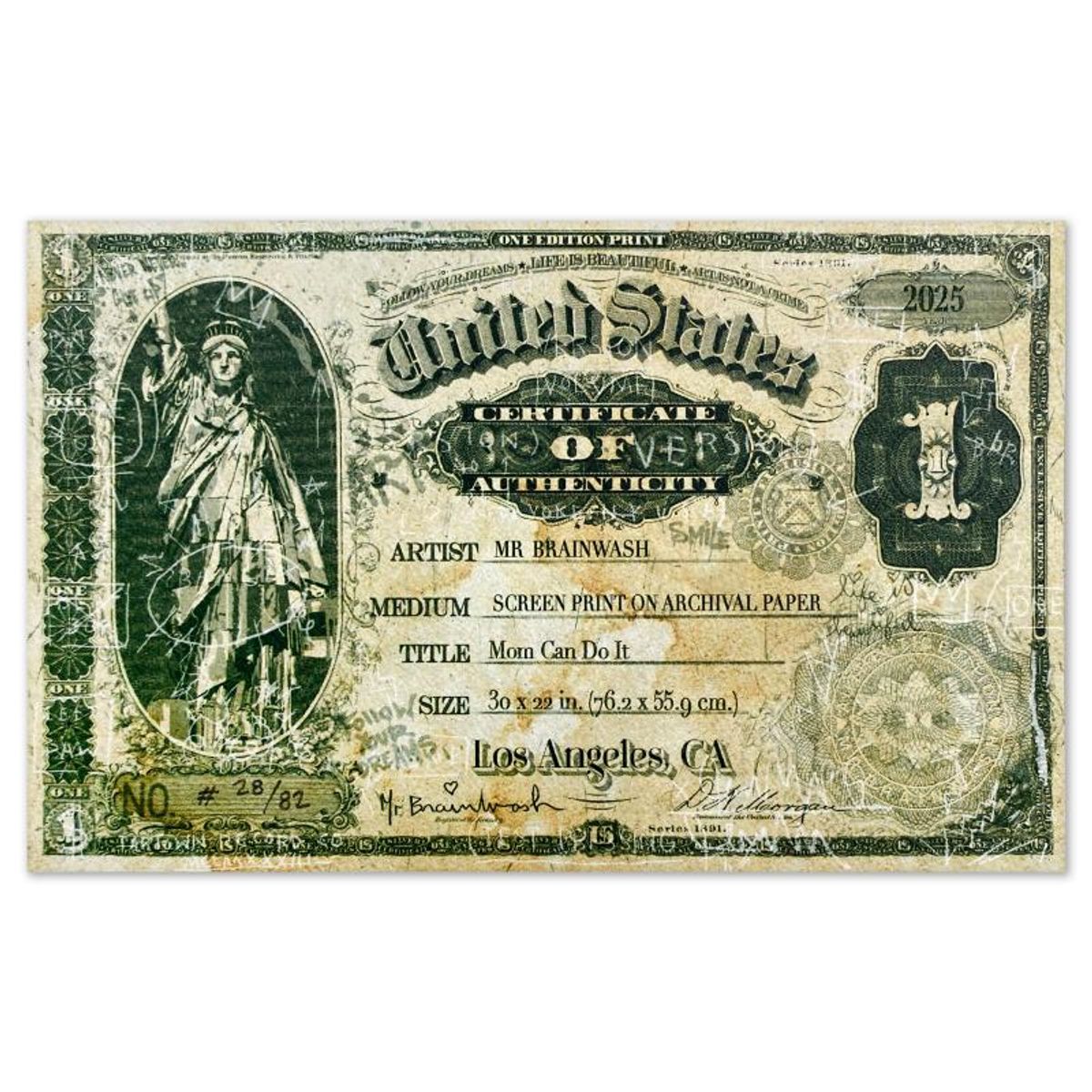 Mom Can Do It, 2025 is a limited edition silkscreen on deckle edge paper by Mr Brainwash, numbered and hand signed by the artist. This piece comes framed. Includes Certificate of Authenticity. Measures approx. 34" x 26" (frame), 30" x 22" (image). This item requires special handling and may have longer than usual turnaround.