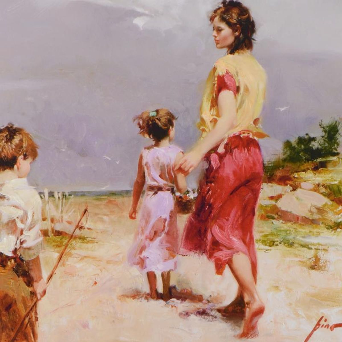 Pino's portraits allow glimpses into intensely personal, intimate spaces, conveying emotion through rich, warm color and sensual brushwork. "Going Fishing" is a hand embellished limited edition giclee on canvas by Pino (1939-2010). The piece is numbered, hand signed, custom framed, and includes certificate of authenticity. Measures approx. 35.5" x 35.5" (frame), 24" x 24" (image). This item requires special handling and may have a longer than usual turnaround. Reference#: 92819.
