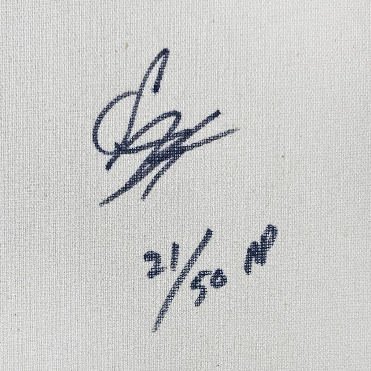 Jesus in Thorns is a hand embellished limited edition silkscreen on canvas by Andy Warhol protege, Steve Kaufman (1960-2010), numbered AP 21/50 inverso and hand signed by the artist. This piece comes custom framed. Includes Letter of Authenticity. Measures approx. 16.5" x 16" (frame), 13.5" x 13" (image). This item requires special handling and may have a longer than usual turnaround.