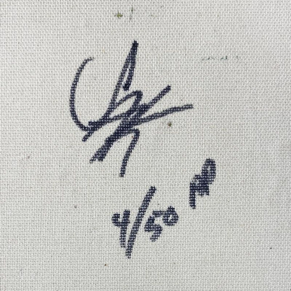 Moses & the Ten Commandments is a hand embellished limited edition silkscreen on canvas by Andy Warhol protege, Steve Kaufman (1960-2010), numbered AP 4/50 inverso and hand signed by the artist. This piece comes custom framed. Includes Letter of Authenticity. Measures approx. 16.5" x 16.5" (frame), 13.5" x 13.5" (image). This item requires special handling and may have a longer than usual turnaround.