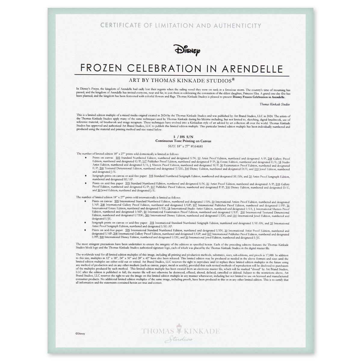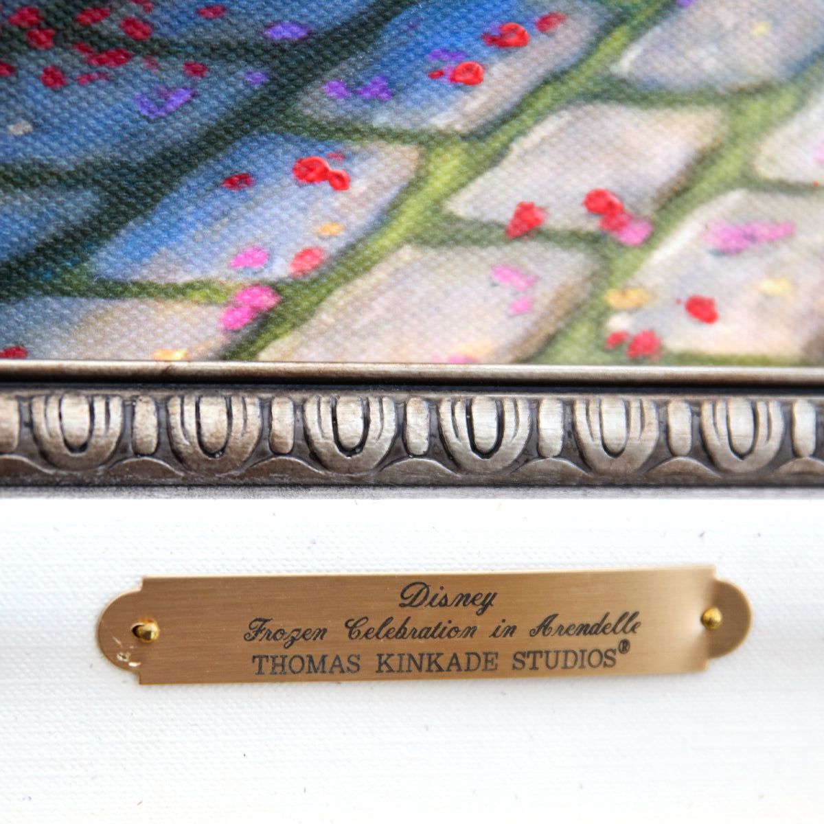 Artist: Thomas Kinkade. Medium: Hand Embellished Giclee on Canvas. Title: Frozen Celebration in Arendelle. Size: 17" x 26". Measures approx. 27" x 36" (framed). Signature: Hand signed and numbered. Certificate of Authenticity: Is included. Reference#: 85618.