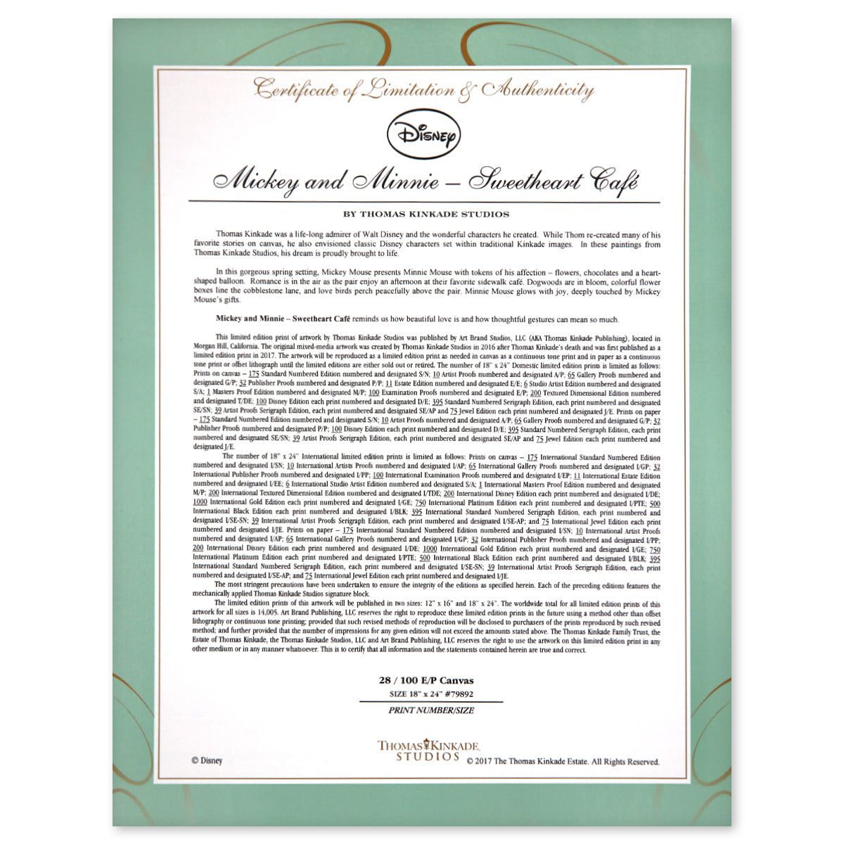 Artist: Thomas Kinkade. Medium: Hand Embellished Giclee on Canvas. Title: Mickey and Minnie Sweetheart Cafe. Size: 17.5" x 23.5". Measures approx. 25.5" x 31.5" (framed). Signature: Hand signed and numbered. Certificate of Authenticity: Is included. Reference#: 85615.