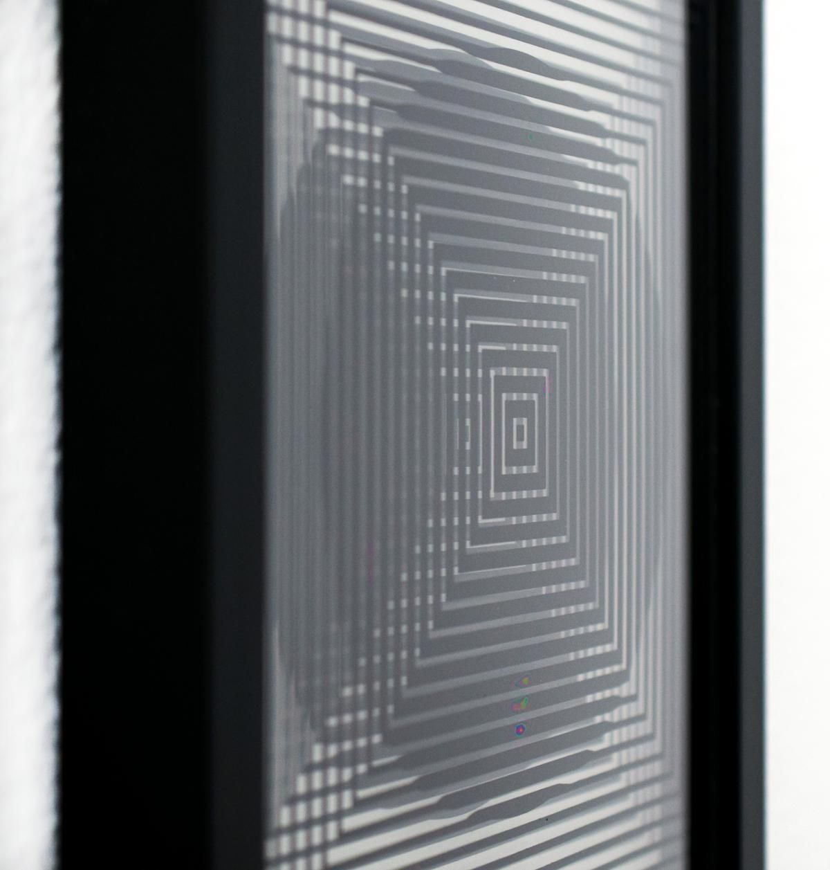 Artist: Victor Vasarely. Medium: 3D Wall Sculpture/object. Title: Cinetiques. Size: 11" x 9". Measures approx. 13" x 10.5" (framed). Additional: Custom Framed. 2 layers- Top layer printed on clear Lucite, bottom layer print on paper. From the portfolio Vasarely Cinetiques. Published by Edition Du Griffon Neuchatel. Circa 1973. Printed in Switzerland.. Reference#: 21367.