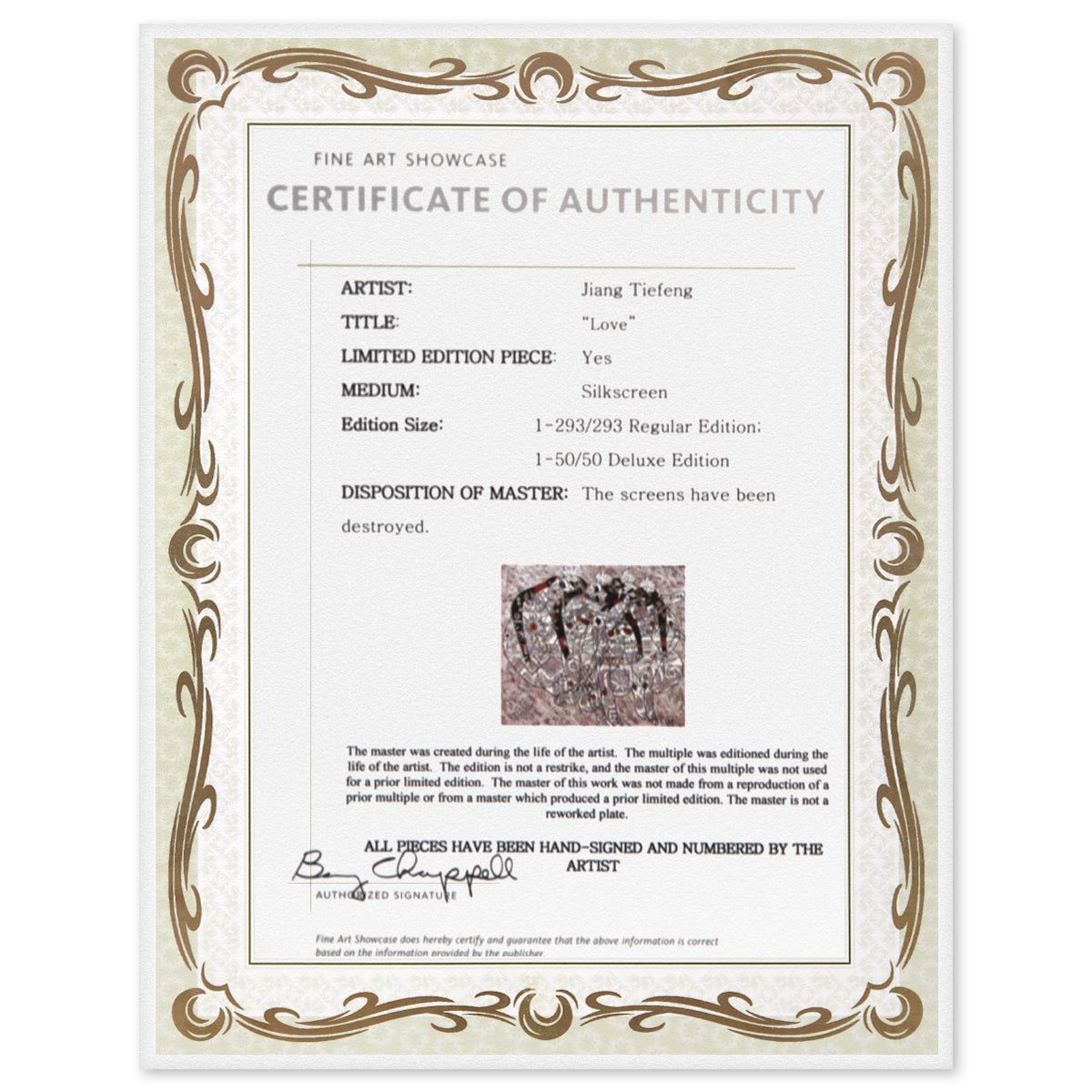 Artist: Jian Tie Feng. Medium: Silkscreen. Title: Love. Size: 20" x 21". Signature: Hand Signed and Numbered. Reference#: 80577.