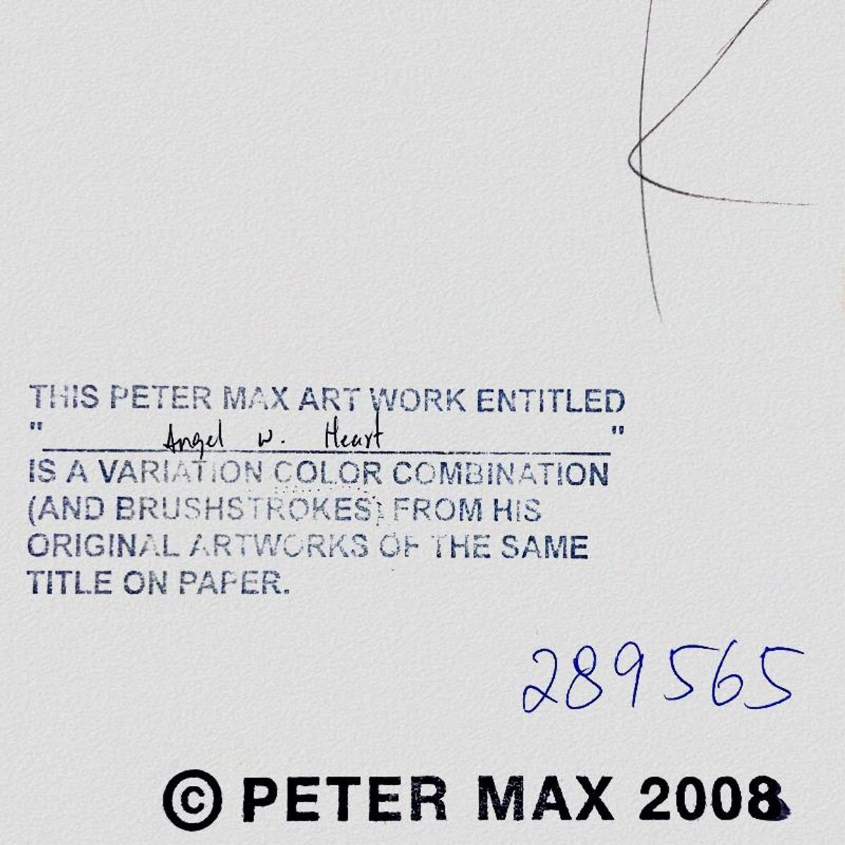 Angel with Heart is a one-of-a-kind mixed media on paper, hand signed by Peter Max. The piece comes custom framed with a backside cutout to display Peter Max Studio registration number 289565 certifying authenticity. Measures approximately 48" x 36" (frame), 36" x 24" (image). This item requires special handling and may have a longer than usual turnaround.
