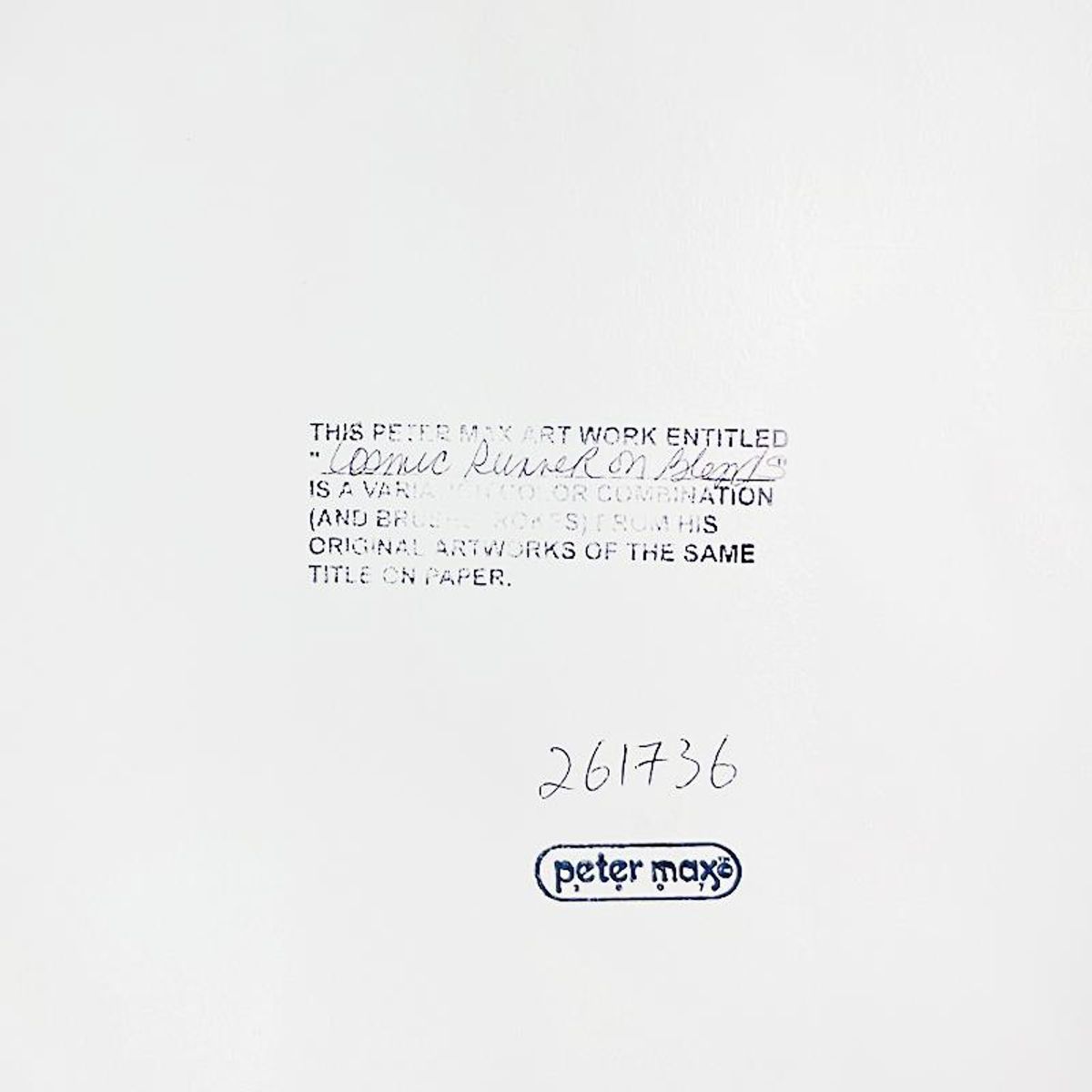 Cosmic Runner is a one-of-a-kind acrylic mixed media on paper, hand signed by Peter Max. The piece comes custom framed with a backside cutout to display Peter Max Studio registration number 261736 certifying authenticity. Measures approx. 30" x 26" (frame), 17" x 13" (image). This item requires special handling and may have a longer than usual turnaround.