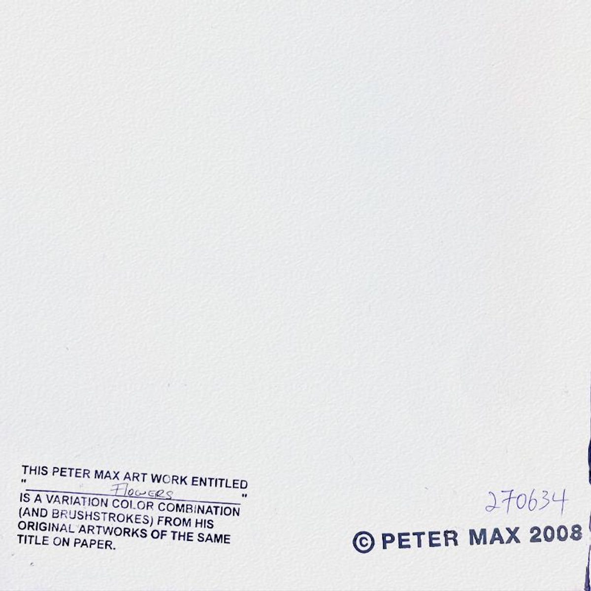 Flowers is a hand signed one-of-a-kind acrylic mixed media on paper by Peter Max. The piece comes custom framed with a backside cutout to display Peter Max Studio registration number 270634 certifying authenticity. Measures approximately 26" x 23" (frame), 13" x 10" (image). This item requires special handling and may have a longer than usual turnaround.