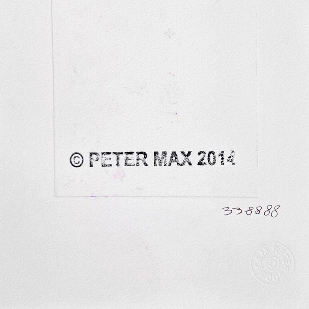This is a one-of-a-kind mixed media on paper, hand signed by Peter Max. The piece comes custom framed with a backside cutout to display Peter Max Studio registration number 338888 certifying authenticity. Measures approximately 22.5" x 20" (frame), 8.5" x 6" (image). This item requires special handling and may have a longer than usual turnaround.