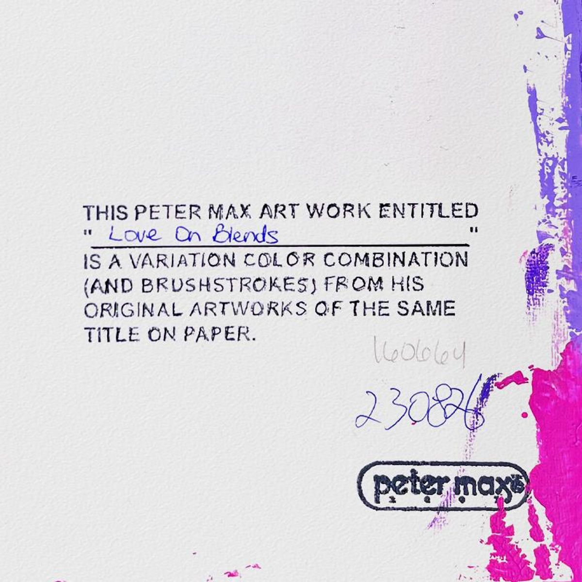Love is a one-of-a-kind acrylic mixed media on paper, hand signed by Peter Max. The piece comes custom framed with a backside cutout to display Peter Max Studio registration number 230826 certifying authenticity. Measures approximately 24" x 22" (frame), 10" x 8" (image). This item requires special handling and may have a longer than usual turnaround.