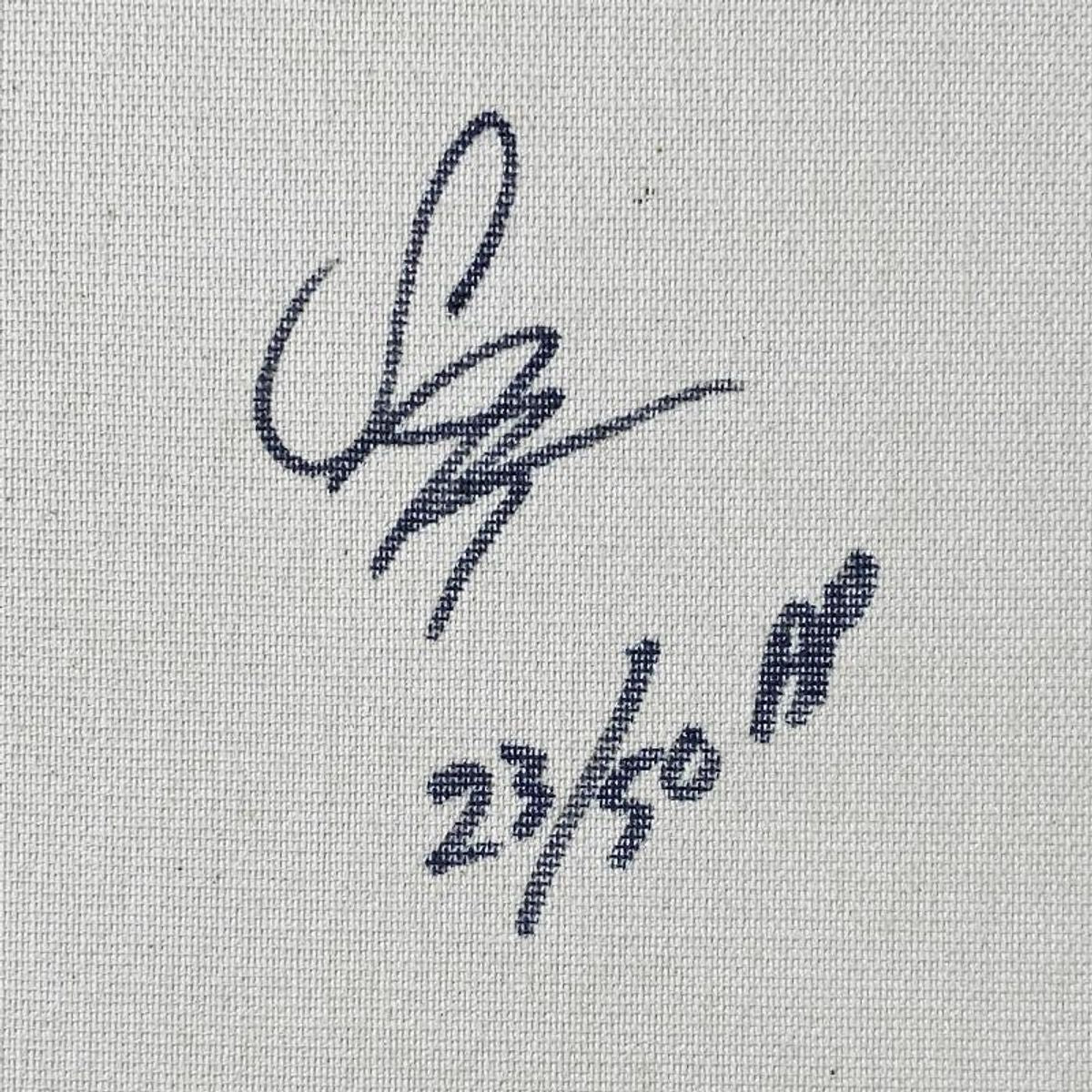 Moses & the Ten Commandments is a hand embellished limited edition silkscreen on canvas by Andy Warhol protege, Steve Kaufman (1960-2010), numbered AP 23/50 inverso and hand signed by the artist. This piece comes custom framed. Includes Letter of Authenticity. Measures approx. 16.5" x 16.5" (frame), 13.5" x 13.5" (image). This item requires special handling and may have a longer than usual turnaround.